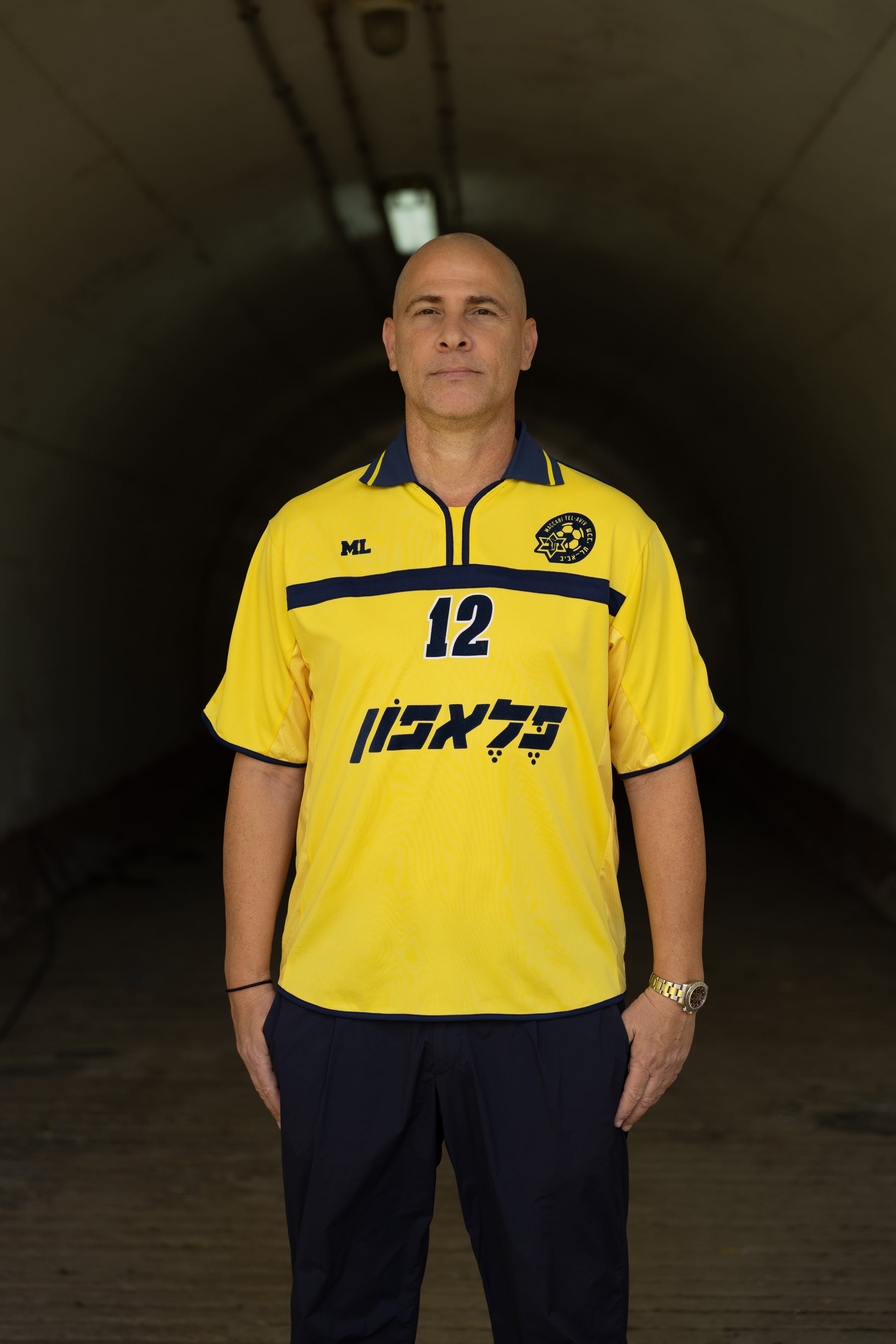 חולצת רטרו צהובה של עונה 2000/01 עם לוגו מכבי הישן והספרה 12 של שחקן הקבוצה מני לוי בחזית וגב החולצה.