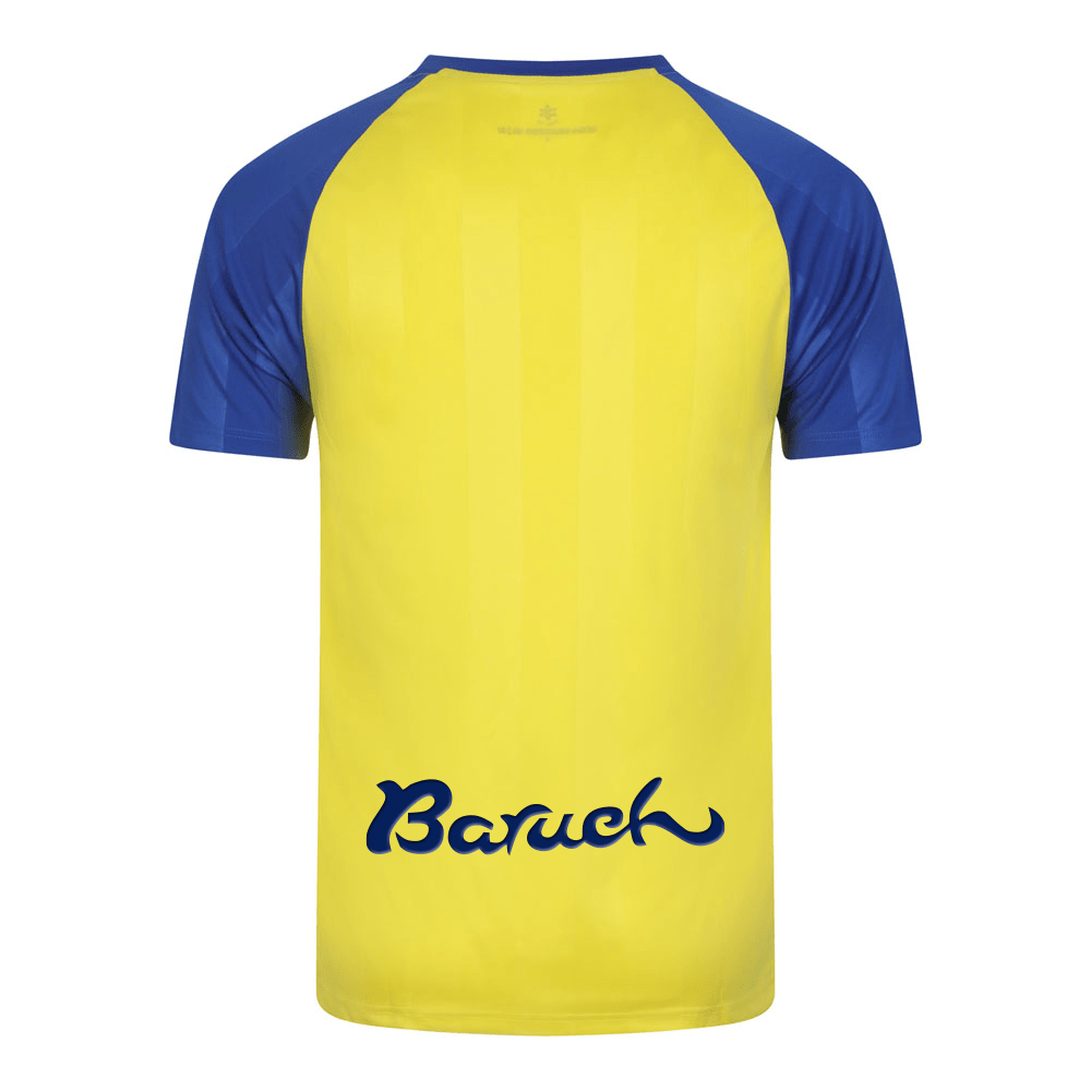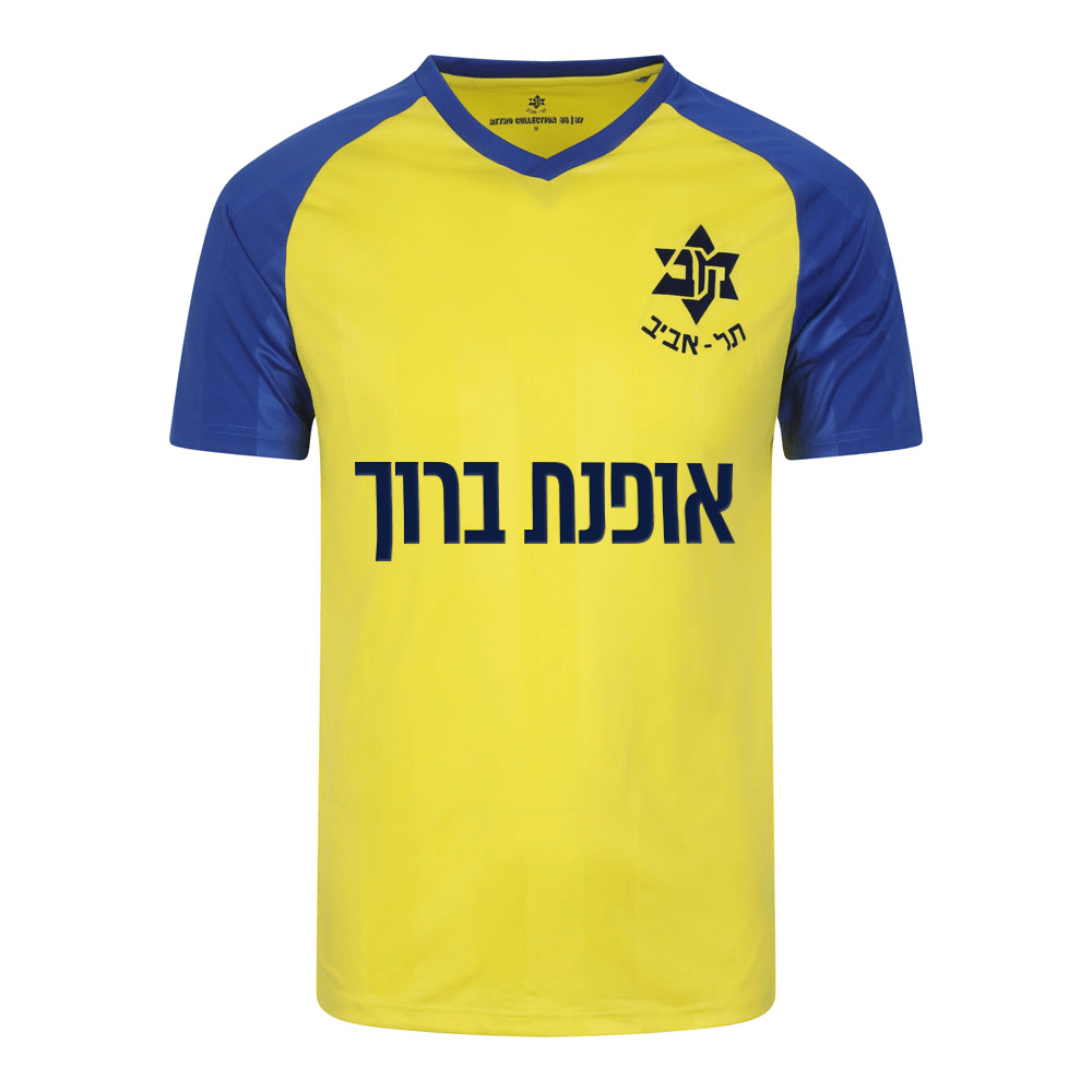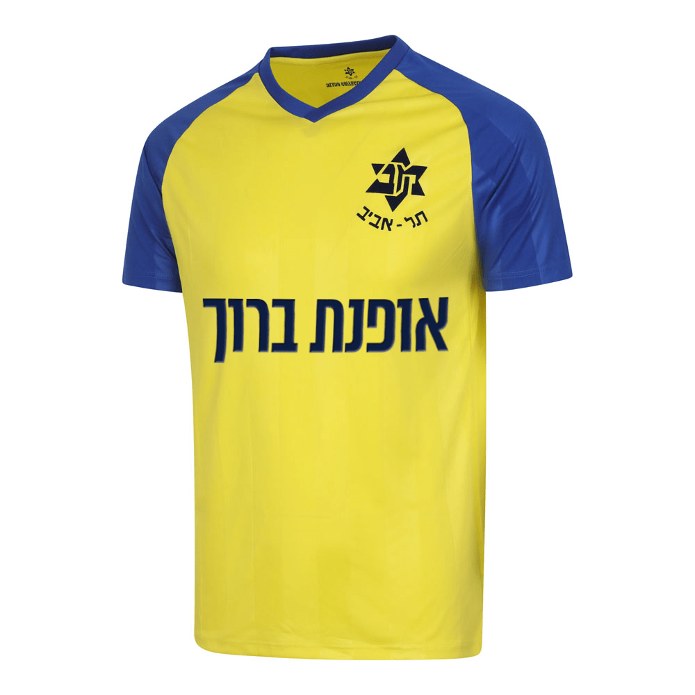 חולצת רטרו צהובה של עונה 1986/87 עם לוגו מכבי הישן והכיתוב המפורסם של 'אופנת ברוך' בחזיתה.